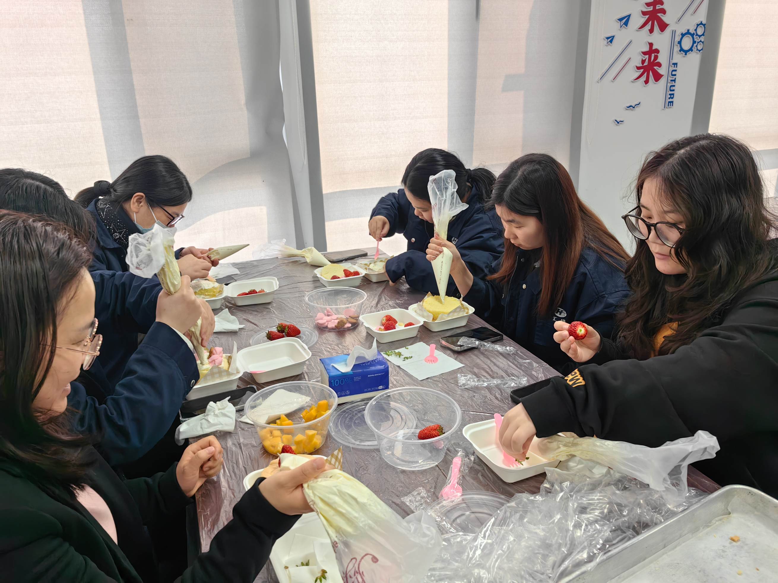 活动一开始,平日里敲击键盘的双手,今天拿起了裱花袋。公司特别准备了新鲜食材,从松软蛋糕胚的铺陈,到香甜奶油的涂抹,再到新鲜水果的装饰……每一个环节都充满了新奇与乐趣。大家围坐在一起, 迫不及待地开始动手实践。